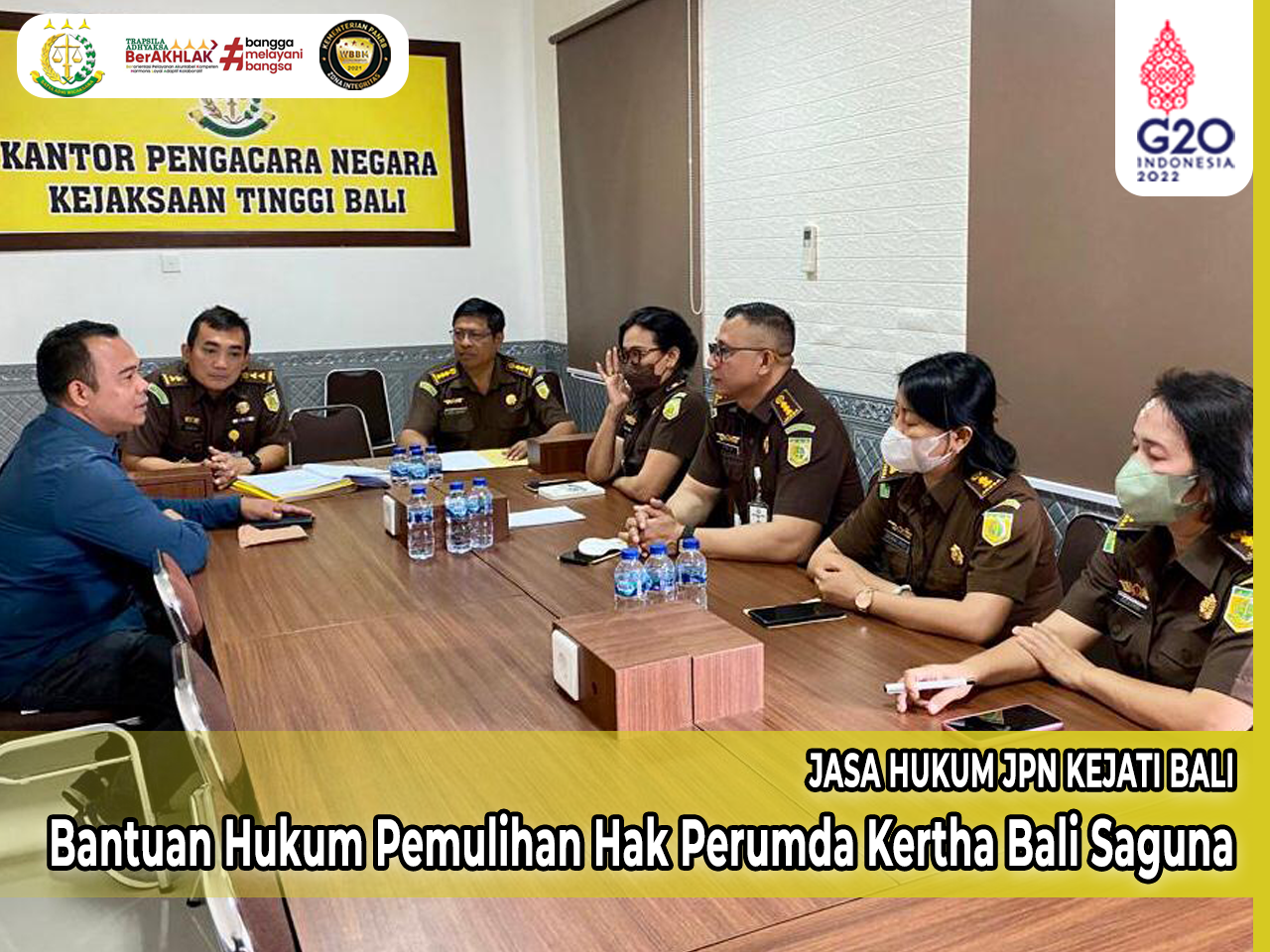 Pada hari Senin tanggal 7 November 2022 bertempat di kantor Pengacara Negara Kejaksaan Tinggi Bali, Jaksa Pengacara Negara memberikan jasa hukum Bantuan Hukum Non Litigasi Pemulihan Hak menindaklanjuti Surat Kuasa Khusus yang dimohonkan oleh Direktur Utama Perusahaan Umum Daerah Kertha Bali Saguna Provinsi Bali sehubungan dengan penagihan piutang pada Unit Perkebunan Sangiang kepada UD Eka Jaya.