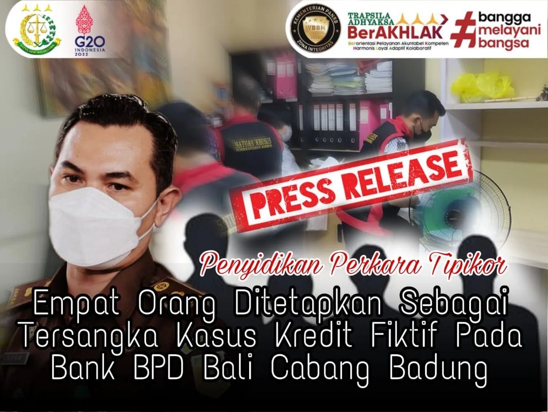 Kejaksaan Tinggi Bali menetapkan 4 orang tersangka dalam penyidikan dugaan tindak pidana korupsi kredit fiktif berupa kredit modal kerja (KMK) usaha dan konstruksi pengadaan barang dan jasa BPD Bali Cabang Badung. Selain melakukan tindak pidana korupsi, keempat tersangka diduga melakukan tindak pidana pencucian uang. Keempat tersangka tersebut yaitu dengan inisial IMK, DPS, SW dan IKB.