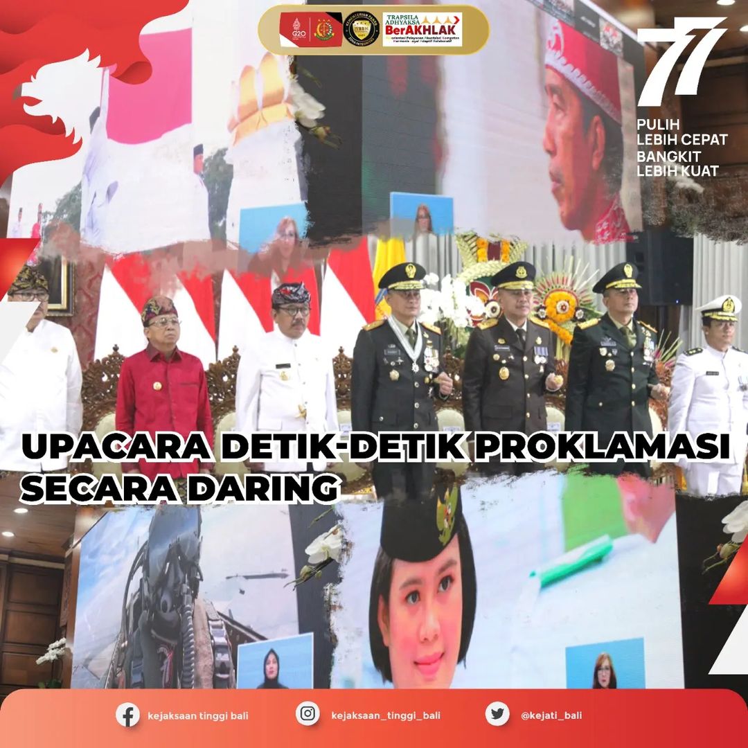 Rabu, 17 Agustus 2022, secara daring, dari Ruang Rapat Gedung Gajah Jayasabha Denpasar, Kepala Kejaksaan Tinggi Bali bersama Gubernur Bali dan Forum Komunikasi Pimpinan Daerah Provinsi Bali, hadir dalam Upacara Detik-Detik Proklamasi yang dipusatkan di Istana Merdeka dengan Inspektur Upacara, Presiden Republik Indonesia, Joko Widodo.