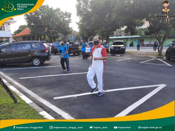 Pegawai Kejaksaan Tinggi Bali melaksanakan senam pagi pada hari Jumat, 19 Juni 2020..Senam dengan menggunakan Masker, menerapkan physical distancing dan pengukuran suhu badan sebelum melaksanakan senam menjadi