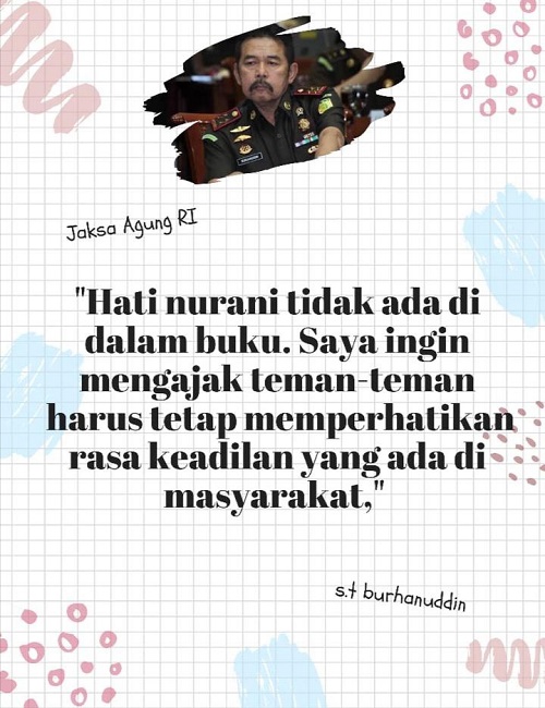 Selamat Sore Sobat Adhyaksa Quote sore ini dari Bapak Jaksa Agung RI, Burhanuddin untuk kita semua : " Hati Nurani tidak ada didalam buku. Saya ingin mengajak teman-teman harus tetap memperhatikan rasa k