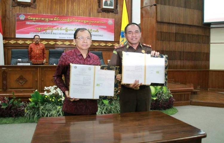 Kegiatan Penandatanganan Nota Kesepahaman ( MOU) Kejaksaan Tinggi Bali dengan Pemprov Bali yang ditandatangani oleh Kepala Kejaksaan Tinggi Bali Dr. Amir Yanto dan Guburnur Bali I Wayan Koster dimana turut h