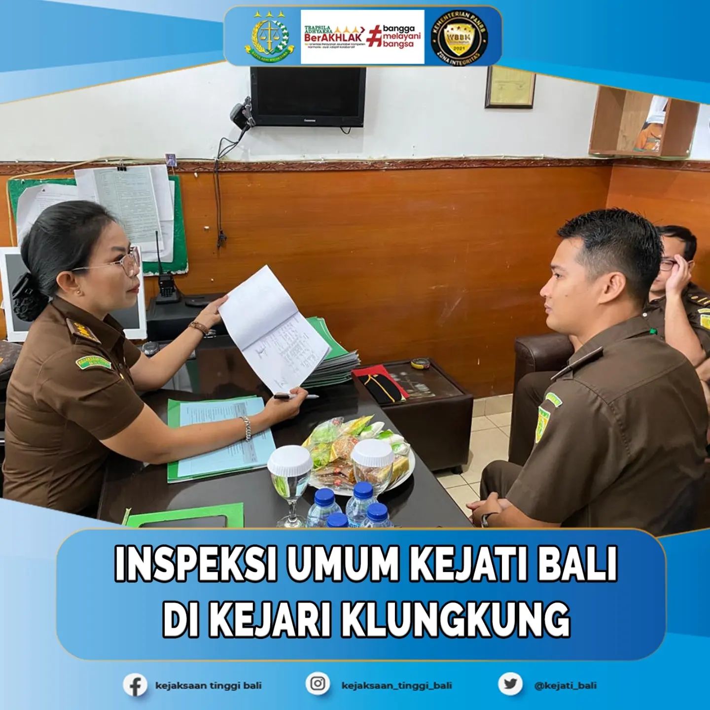 Telah dilaksanakan kegiatan inspeksi umum pada kejaksaan negeri Klungkung dan Cabang Kejaksaan Negeri Klungkung oleh bidang Pengawasan Kejaksaan Tinggi Bali yang dipimpin Asisten Bidang Pengawasan Kejaksaan Tin