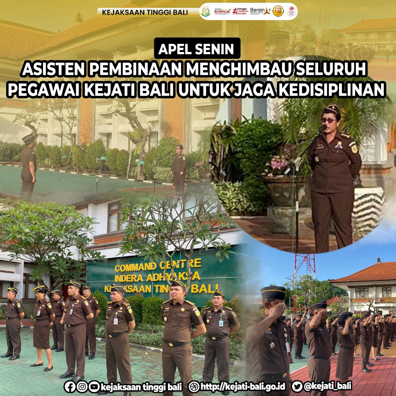 Asisten Pembinaan Kejaksaan Tinggi Bali, Dr. Ni Wayan Sinaryati, S.H., M.H., memimpin pelaksanaan apel, pada hari Senin, 12 Juni 2023. Kegiatan upacara diikuti oleh para Asisten, para Koordinator, Para Kasi, Pa