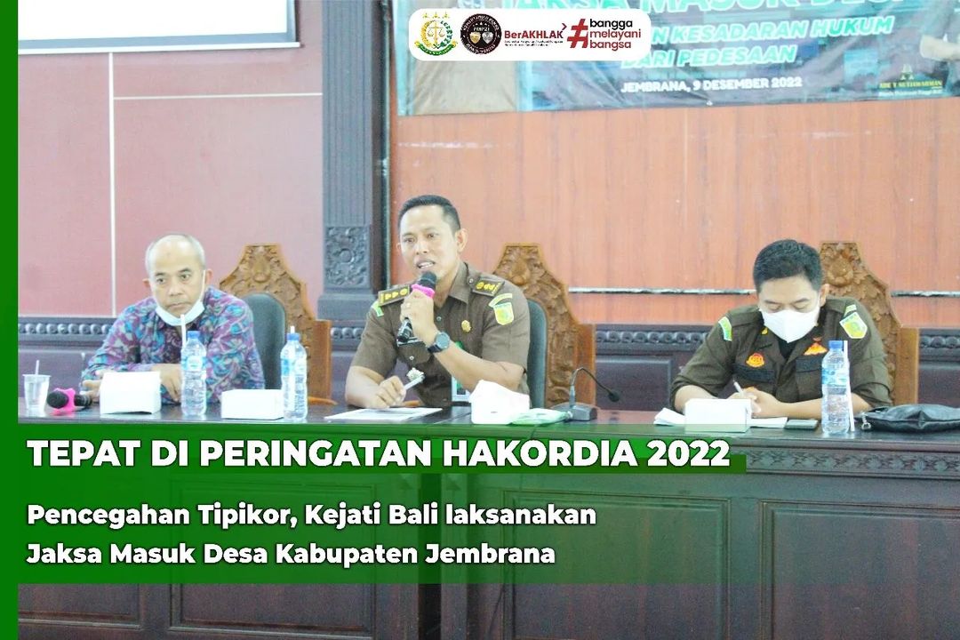 Kepala Seksi Sosial Budaya Kemasyarakatan Kejati Bali, A.A. Ngurah Jayalantara, SH., MH didampingi Kasi Intelijen Kejari Jembrana memberikan Penerangan Hukum kepada Perbekel (Kepala Desa) di Kabupaten