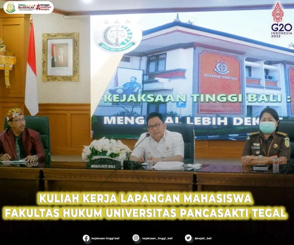 Rabu, 9 Nopember 2022, Wakil Kepala Kejaksaan Tinggi Bali, Teguh Subroto didampingi Asisten Pembinaan Kejati Bali, menerima mahasiswa Fakultas Hukum Universitas Pancasakti Tegal dalam rangka Kuliah Kerja Lapang