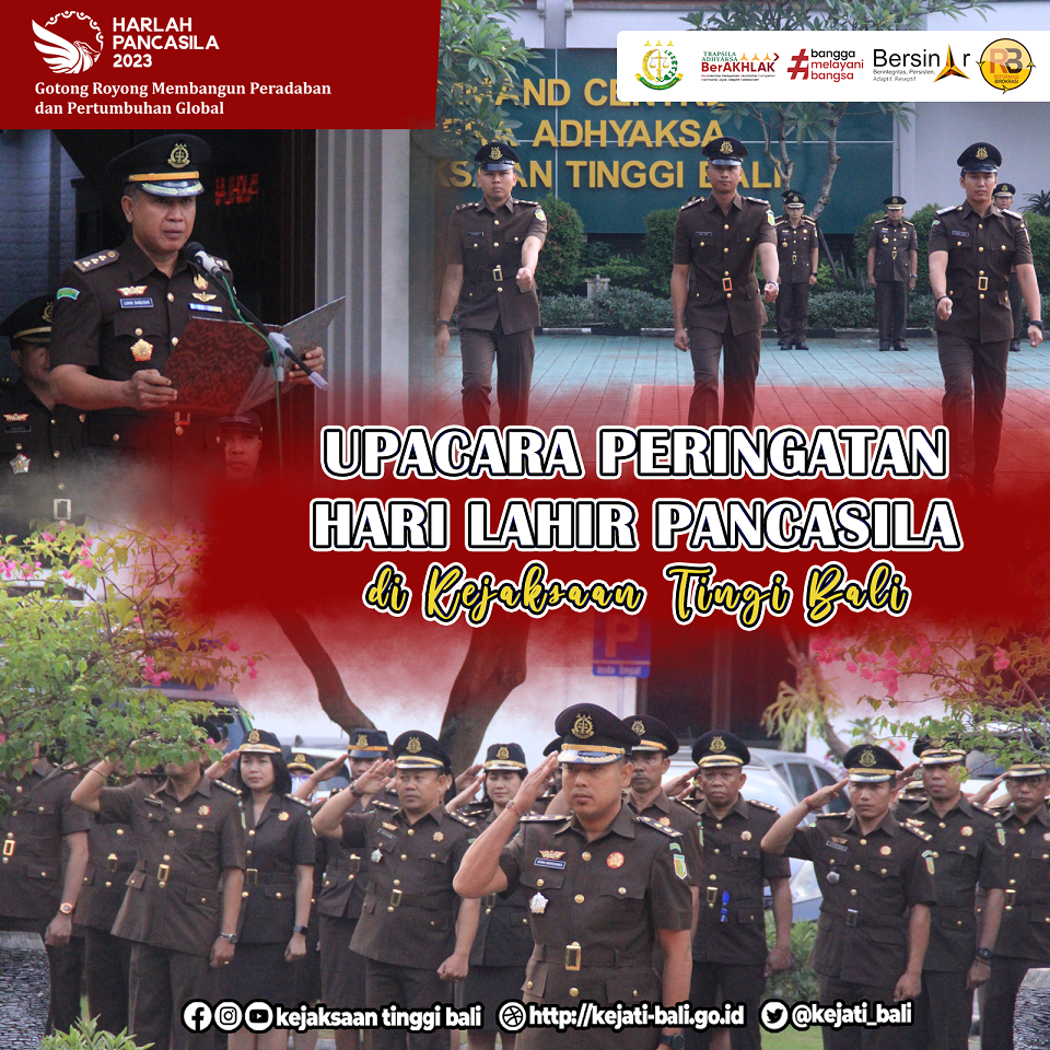 Tepat hari ini, 1 Juni 2023, diperingati sebagai Hari Lahir Pancasila. Bertempat di Lapangan Kejaksaan Tinggi Bali, seluruh Asisten, Koordinator, Kabag TU, Kasi, Kasubag, Pemeriksa, dan Staf Seluruh Bidang di K