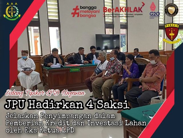 JPU Hadirkan 4 Saksi Jelaskan Penyimpangan dalam Pemberian Kredit dan Investasi Lahan oleh Eks Ketua LPD Ungasan Persidangan perkara dugaan tindak pidana korupsi pada LPD Desa Adat Ungasan, Kabupaten Badung