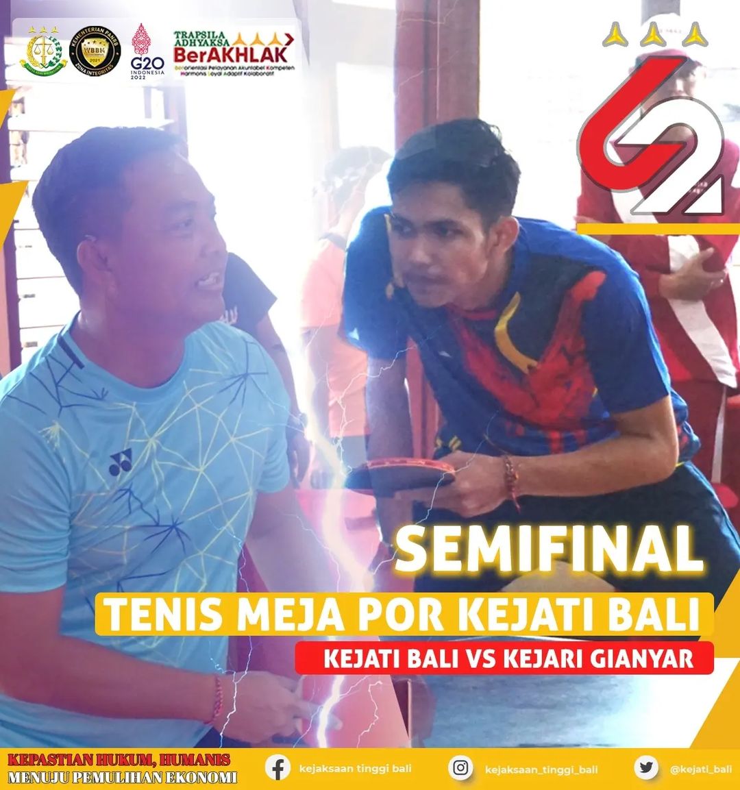 Pertandingan Tenis Meja Putra dalam Pekan Olahraga Kejati Bali menyelesaikan pertandingan penyisihan dengan menghasilkan 4 tim yaitu Tim Beregu Kejati Bali, Kejari Gianyar, Kejari Buleleng dan Kejari Denpasar a