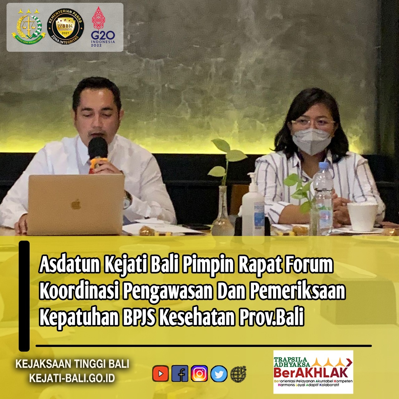 Pada hari Rabu tanggal 29 Juni 2022, Asisten Perdata dan TUN Kejati Bali, Denny Achmad, SH MH memimpin rapat Forum Koordinasi Pengawasan dan Pemeriksaan Kepatuhan BPJS Kesehatan tingkat Provinsi Bali, yang diha