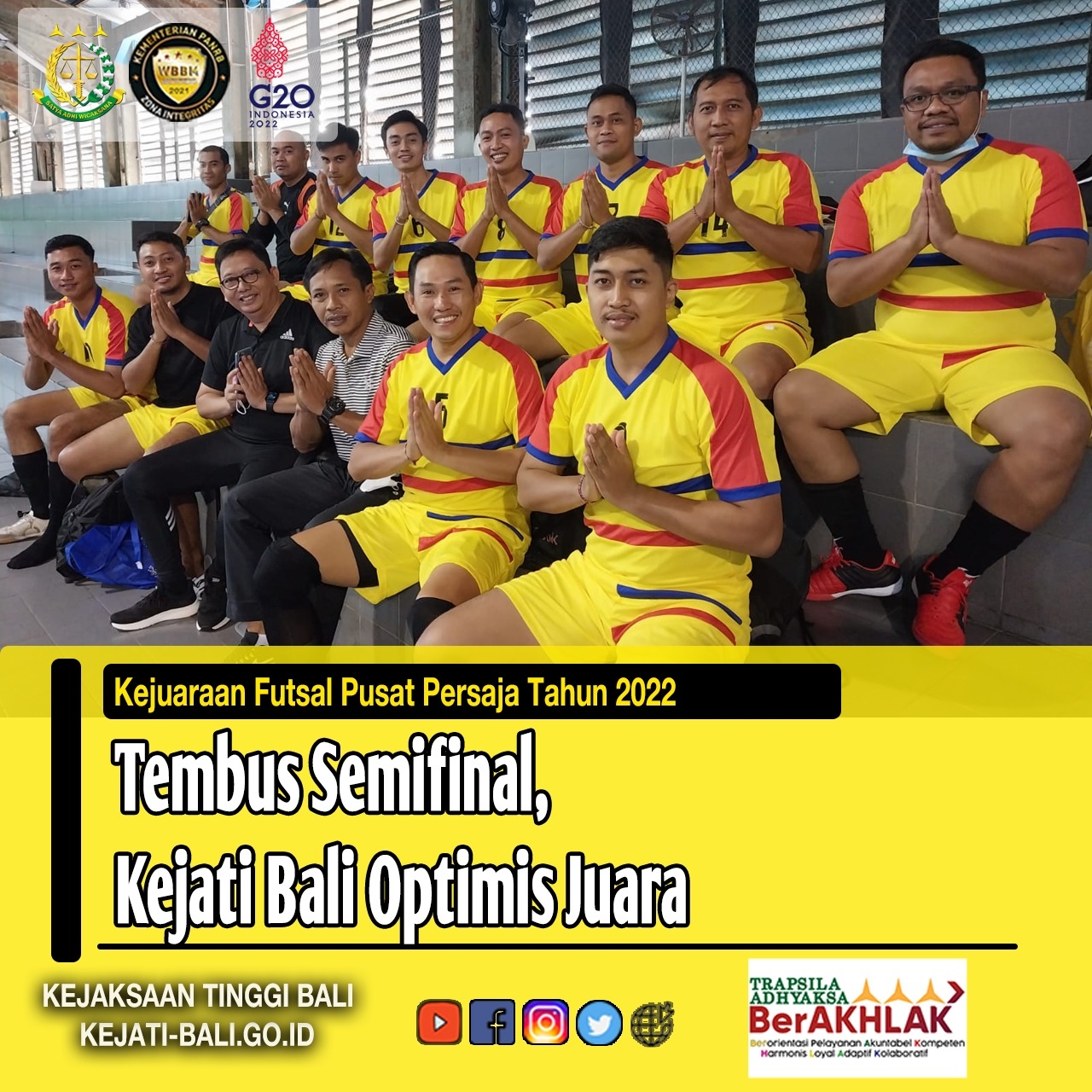 Tim Futsal Kejati Bali turut serta dalam Kejuaraan Futsal Pusat Persatuan Jaksa Indonesia (Persaja) Tahun 2022 yang mengambil tempat di Futsal Court Cilandak Sport Centre, Jakarta. Dalam kejuaraan yang diikuti
