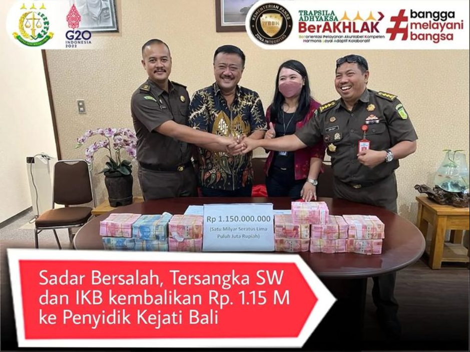 Siaran Pers Kejati Bali Selasa, 28 Juni 2022, bertempat di Kantor Kejaksaan Tinggi Bali, Keluarga dari Tersangka SW dan IKB menyerahkan uang sejumlah Rp. 1.150.000.000,- (Satu milyar seratus lima puluh juta